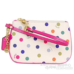 COACH彩色點點桃紅漆皮邊萬用手拿包 COACH新款手拿包,質佳耐用荔枝紋PVC皮質為底輔以受歡迎的彩色小圓點,營造繽紛甜美風格;可收納手機、卡片、鈔票,內裡設置單格卡片夾層,小物分隔擺放更便利,隨身手掛讓你外出散步或午休用餐都能輕便有型。 ★尺寸:拉鍊寬13.5CM中寬16CM、高10CM,掛帶長約16CM(不可調整) ★注意事項:此商品於原廠購買時就無附贈防塵袋、禮盒及紙袋~訂購前請先考慮清楚,謝謝~