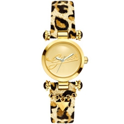 圓形厚版的錶身與時尚簡約的素面錶盤配上金蔥點綴的GUESS草寫LOGO,在奢華的氣氛中,融入高雅、知性的魅力。在特殊設計展現不凡品味的錶耳下有著經典品牌LOGO “?”的吊牌吊飾,而向下延伸出去的則是豹紋軟質皮革錶帶,展現配戴者華麗、獨特的品味,也同時感受到典雅、貴族般的氣質!