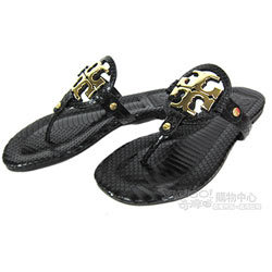 TORY BURCH 蛇紋金屬LOGO平底夾腳涼鞋(黑)