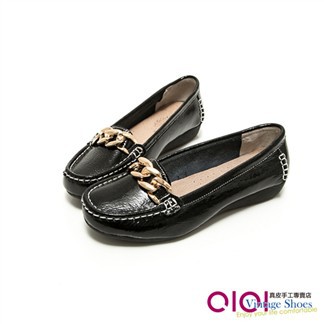 0101真皮手工系列-全真皮金屬鍊條漆皮小坡跟豆豆鞋(黑)【現+預】