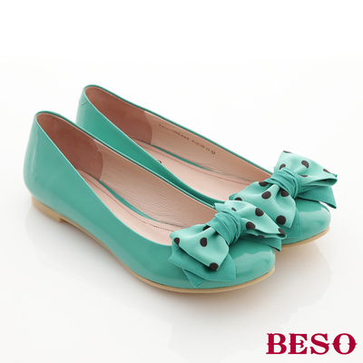BESO蜜糖舞曲-真皮鏡面布料蝴蝶結平底娃娃鞋-玉綠詳細介紹如下~大家一起努力變水水吧