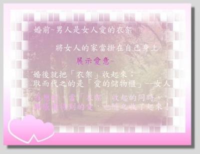 《風中有情天》揹 ◎小颱風  屈臣氏裡仍然是顧客盈門,仔細一看,身邊的人多半是年輕人,一對對的戀人。有趣的是,幾乎男生都揹著女孩的家當呢……。我瞧了瞧自己,一個人,一派輕鬆地走著,覺得很幸福!正想著的...