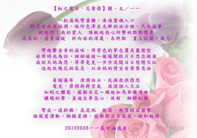 小颱風攝於逸園【我愛妳嗎?】妳問我,愛妳嗎?親愛的!風拂過葉稍,環抱花雨打擊粉嫩,漫漫浸潤中空的心太陽火紅, ...