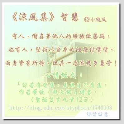 《涼風集》智慧 ◎小颱風有人,多藉前人的經驗為借鏡;也有人,堅持以人生經歷付償價。兩者皆有所得,但其一憑添幾多...