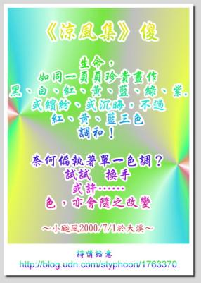 ◎小颱風生命,如同一頁頁珍貴畫作黑、白、紅、黃、藍、綠、紫.………或繽紛、或沉晦,不過紅、黃、藍三色調和!奈何...