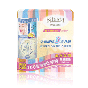 【BIFESTA】抗暗沉即淨卸妝水+化妝棉限定組合商品訊息簡述: ★北市衛粧廣字第10312840號。低刺激配方,無香料、無色素、不含油性成分、不含酒精、不添加paraben類防腐劑!老廢角質不殘留,創造細緻素顏肌!含有保濕型維他命C及柔軟角質乳酸成分,能夠溫和去除老廢角質,讓膚質明亮水嫩、膚觸柔滑細緻。持久型玻尿酸保濕成分預防毛孔阻塞!告別暗黃肌、光亮細緻;所有膚質均適用!