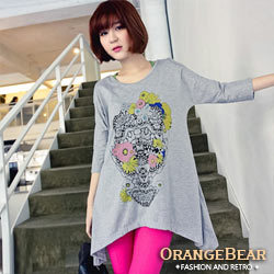 【OrangeBear】繁花燙印圖不規則下擺挖肩長版上衣‧共二色