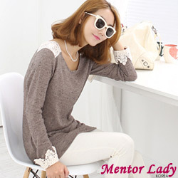 【Mentor Lady】蕾絲反摺袖混色織長上衣 (共二色) ☆浪漫氣質蕾絲反摺袖 ☆甜美性感美肩拼接設計 ☆混色織針讓配色更活潑 ☆舒適顯瘦的長版上衣