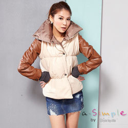 【A-simple】多變造型鬆糕領皮革拼接修身短版保暖鋪棉外套 手套袖