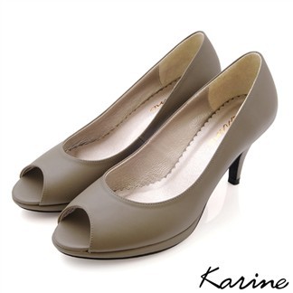 karine(MIT台灣製)全真皮素面魚口高跟鞋-優雅卡其