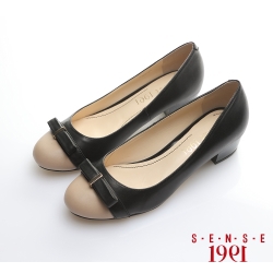 SENSE1991 知性優雅 復古方跟撞色拼接質感蝴蝶結低跟鞋-黑