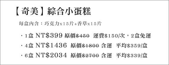 商品訊息簡述: 平均每盒最低只要339元起(2盒免運)即可購得【奇美】綜合小蛋縑G1盒/4盒/6盒(巧克力x15片+香草x15片/盒)。