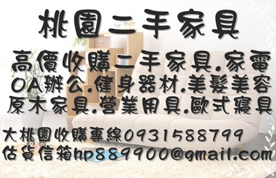 桃園二手家具館~收購中古二手家具把您家中有不要的家具來電撥打一通電話或是寄一封email我們將有專人為您服務把您不要的家具變現金我的電話 : 0931-588799估貨信箱 : hp889900@gm...