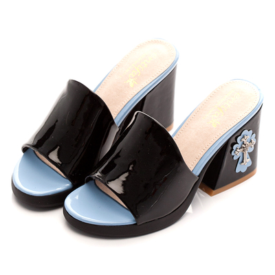 Entifa 性感女伶 一字鏡面五金飾花高跟涼鞋 黑界中掀起一股熱潮,