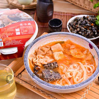 採用道地的韓式泡菜,加上不油不膩的豬五花肉片,精選多種豐富食材:QQ蒟蒻麵、米血丁、凍豆腐、豆皮、香菇,創造出道地的韓式泡菜鍋,微香微辣風味獨特。