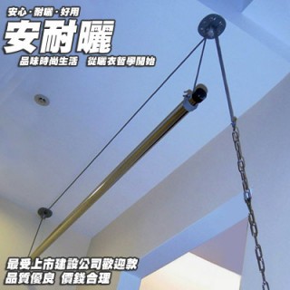 強!完全利用陽台空間曬衣!評價最高升降衣架,完全取代固定式曬衣架再也不需要竹竿叉高高掛,曬衣服變得美觀又整齊,使用簡單輕鬆晾好衣服,省時曬衣好輕鬆,多種組合升降簡易設計,可以針對各種場地做充分空間利用,曬衣繩可承重約30kg重量,換算約有50件衣服, ABS滾輪底座,使用壽命長達10年,堅固耐用,我們都知道,構造越繁雜,使用壽命越不耐久,像是仿間自動升降型、百葉升降型,都會因為某一構造的使用耐久度因素,進而產生故障無法使用,現在化複雜為簡易不僅能大大提昇使用壽命,也提昇生活品質、節省耗材費用,搭配著奈米化防風型伸縮曬衣竿99%不怕生鏽腐蝕,即使風在大也不怕衣物被吹跑,不讓您白白花費力氣在清理衣物;更重要的是,產品給你超大的安心保證,售後保固一年,售後服務無期限,不怕產品壞了無門維修,產品榮獲中華民國新型專利認證115375號。