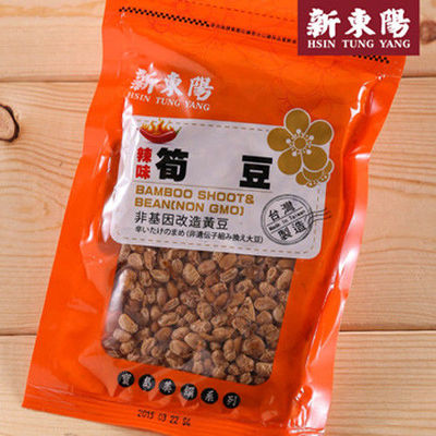 • 新東陽筍豆以精選進口非基因改造黃豆搭配不含漂白劑和防腐劑的台灣筍絲為原料,加上獨家調味配料滷汁,慢火滷煮收汁入味讓黃豆完全吸飽筍絲及配料的風味,再逐漸烘焙乾燥製成。