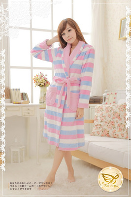 女王也愛穿,型男買給女友的首選名單~【Sexy up】條紋佳人 珊瑚絨一件式睡袍(藍粉白)