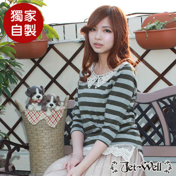 [J-Well]日系進口蕾絲七分袖條紋針織上衣(灰綠)★8W2250在這買最好康