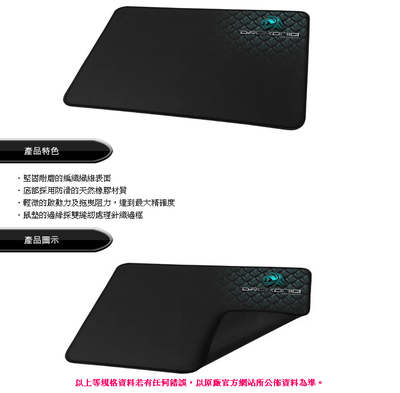 旋剛馭龍者Drakonia速度型競技專用鼠墊在正面印有馭龍者酷炫圖騰,更是馭龍者雷射電競滑鼠最佳搭配的戰鬥夥伴。鼠墊表面採用耐磨性高的編織纖維,而且是以最受玩家歡迎的速度型編織手法,加上表層使用奈米塗佈處理,可將拖曳滑鼠所產生的阻力值降至最小,確保滑鼠快速到達定位 ,讓遊戲玩家在激烈操作下可達到安靜,滑順,快速, 精準的最高標準。