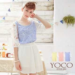 momo購物台,momo購物網:【YOCO】綴珠玫瑰花紋蕾絲袖上衣-S.M