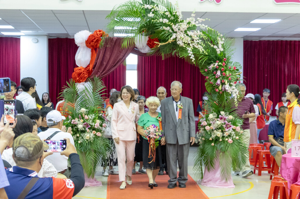 典禮開場,由市長周佳琪親自陪同今日出席典禮婚齡最長的模範夫妻—陳豐治與張香惠伉儷,一同步上紅毯,走過精心設計的幸福拱門進場,象徵攜手共度人生、花開綻放的美好婚姻。隨後,所有受表揚的模範夫妻也在掌聲與祝福中陸續進場,氣氛溫馨感人。並且由「前進國小管樂隊」,以長笛、豎笛、中音薩克斯風等樂器,演奏「甜蜜蜜」等感動人心的歌曲,讓受表揚的佳偶,能在親友團們的陪伴與祝福裡,重溫甜蜜時光。