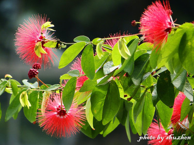 紅粉撲花:花絲細長為鮮紅色絲絨狀,狀似粉撲。 科別:含羞草科 (豆科)學名:Calliandra emarginata (Willd) Benth. 別名:凹葉紅合歡、凹葉合歡、粉紅合歡。 類型:半落...