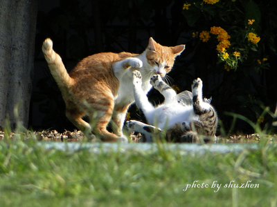 冬陽下 一群貓兒 走進了寬闊的校園裡 老貓兒 瞇起眼睛 享受着 冬陽的溫暖 年輕的貓兒 則肆無忌憚的 盡情嬉鬧 這兒 就是 貓兒們獨享的天堂 下課的鐘聲 驚動了貓兒的慵懶 孩...