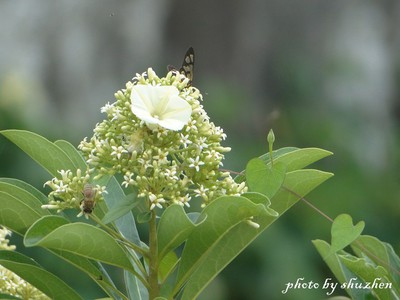 一朵姬牽牛攀爬而上 爬上台灣海桐如錐的花序上 啊,是不是一種撒嬌與...