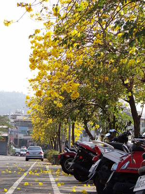 黃花風鈴木三月初拍攝於東籬園旁,二月底行經后里三豐路,亦見有同色長排風鈴木盛放,美了車行匆匆的路容,鮮明高懸...
