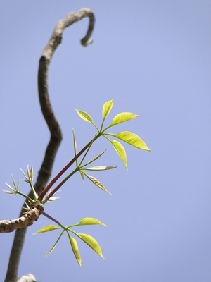 4月9日的木棉...... 有些新葉長出,以美麗的清新弧度。〈 掌狀複葉 〉 部分已結了果實,不久後會棉絮飛...