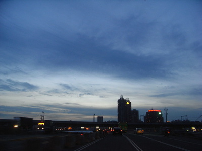 暮晚時分,雲霞在天空畫滿溫柔的符號!樹、屋子、高架的道路都是剪影,行過的汽車也成了流動的剪影;顯得特別地沉謐寧...