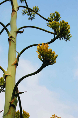 此區龍舌蘭有七、八株,有三株母株已完全乾枯。另有幾棵仍有珠芽生長,但母株同樣是在萎縮的狀態。而有一兩棵目前還同時長著好幾條較細的花莖橫斜著〈花莖上已是成長中的珠芽〉,母株身上亦有許多珠芽,有些已長的得很大......。