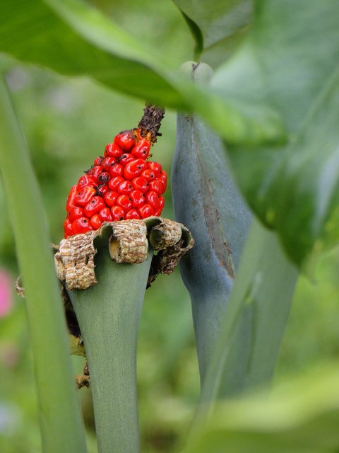 多年生直立性草本;根莖粗短,肉質;莖高 30~80 公分,具環形葉痕。葉片半盾狀生或廣卵狀心形,先端銳尖,全緣,長可達 1 公尺,葉柄長,略包莖,葉鞘基部可積水。花序柄常單生;春季開花,佛焰苞肉質,綠色;雌花在下,雄花在上,中央為中性花。漿果球形,紅色,具少數種子。