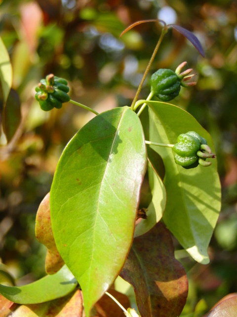 葉: 葉為單葉對生,卵形,長 3~7 公分,寬 1.5~3.5 公分,先端尖或漸尖,基部狹或圓,有時亦為心形,革質,全緣;表面呈有光澤的綠色,背面則為淡綠色,表裡兩面皆光滑無毛,背面有油腺點;側脈每邊 4~6 條,略隆起,一直延伸至葉緣 0.2~0.3 公分處;葉柄甚短或近似無柄。