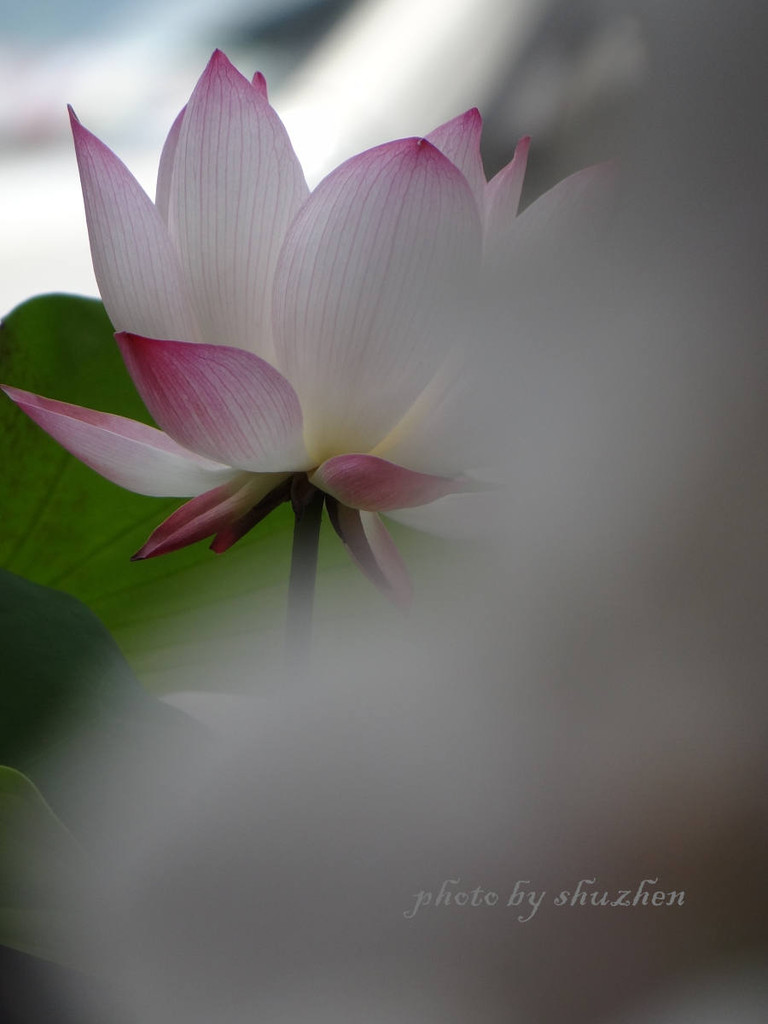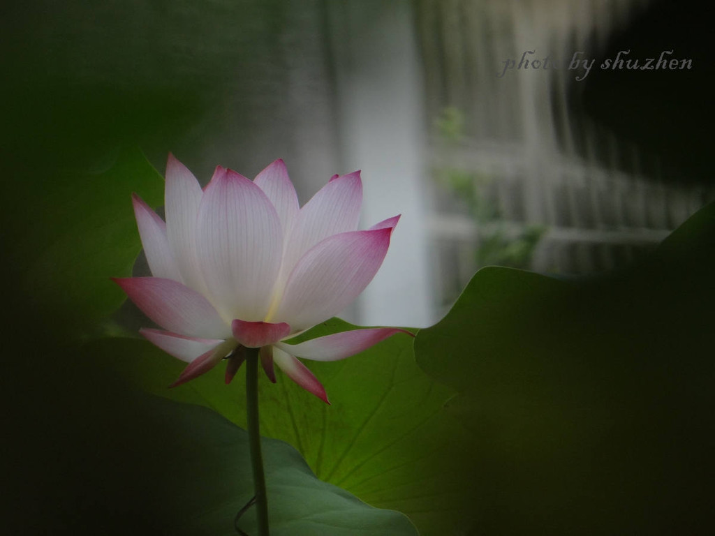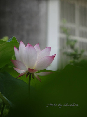 無法出去,於是還是去拍那朵荷花。才離開幾分鐘再過來,花葉上的光影已經有了一些不同。陽光進來了,因為一旁大樹葉子的搖晃,使得穿過葉片灑下的陽光時而照在葉上、時而移走。風的關係吧,移動間很快,想拍攝光影的感覺,必需把握住陽光跳動的瞬間,準確地按下快門。然而也才一會兒功夫,陽光又不見了,因此也很快便結束了與光影的遊戲。而後幾番繞轉,走到荷花的後方去,藉著掛在樹幹上的白花蝴蝶蘭來模糊前景,只顯現出荷花的部份身影。這樣照片中呈現前景的那一抹白它似如棉絮亦似浮雲掠過,不管結果是好是壞,總之是一種嚐試與練習。這麼玩過之後又努力地去尋找是否還有其他可能,很意外地,透過灌木叢低矮處的小縫隙略為往上去看荷花,竟然看見了這天最美的一個景。荷花與幾片圓葉襯著遠方的窗,或許是那幾片圓葉發揮了作用,產生了錯覺,讓人不會感覺這僅只是只開著一朵花的小盆景,倒可以想像彷彿是某個院子角落有個小小的荷花池。也因為那個壁面窗景使得照片裡彷彿有些什麼故事可以緩緩流訴……。發現這樣的視野時,覺得非常感謝那關上讓自己出不去的大門。要不也就沒有這一日這最後教自己動容的拍攝與發現。