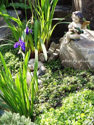 提起小天使於是想起使用它們的緣由,原來很想要有一隻貓來為園景添趣。一隻慵懶的貓兒躺臥搖椅上是多麼符合「閒情」這樣的題名!只是尋來尋去沒尋到心目中的最佳貓主角。雖找回了一隻與真貓十分相似半斜臥的絨毛貓、也極有慵懶情致,卻考慮牠並不適宜放在戶外的庭景中,於是三個可愛小天使便加入成了另一種趣味。