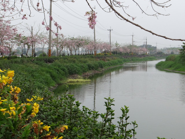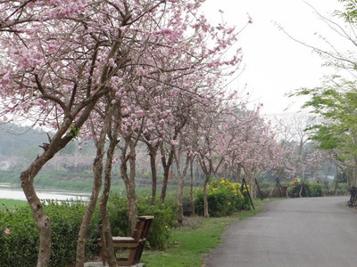 不過真的很美的景觀,長長一列淺淺紫粉的南洋櫻旁是個湖塘,並且頗有規模。是何其幸運,花開有時呢,這日竟如此意外地相遇了美樹花開正怡然。沒有陽光的天氣,照片上也許顯現不出燦亮,但身在其境的沉謐怡悅教人想停留得更久長。湖泊、花徑小道,這樣的優美氛圍很難不讓人醉,醉在春柔的花漾裡,醉在長長一列淺淡粉嫩的美花林道。