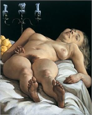 【註22】此段原文是:「I could isolate, consciously, little. Everything seemed blurred, yellow-clouded, yielding nothing tangible. Her inept acrostics, maudlin evasions, theopathies-- every recollection formed ripples of mysterious meaning. Everything seemed yellowly blurred, illusive, lost. 」。若依文中「離合體」的暗示,截取每個字頭,即可讀出這樣的信息:「Icicles by Cynthia, meters from me, Sybil.」(冰柱出於森喜雅,計時器來自我,絲帛)。 又,此段原文總計三十二字,「32」與自由落體(譬如冰柱的水滴)的重力加速度有關(g=32.1740ft/s2),而據安東尼‧伯吉斯(Anthony Burgess,1917-1993)的分析,這也正是喬艾斯《為芬尼根守靈》書中最為關鍵的一個數字。由此數字遊戲可見,以文字遊戲結束的此文,與喬艾斯那本文字遊戲的鉅作頗有另一層的關聯。【圖:John Currin, Nude on a Table(2001)】