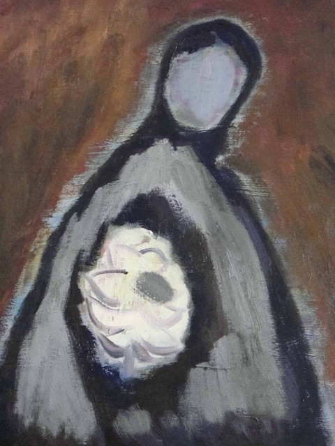 就像你所繪的黑漆人型.包著一株蓮(蓮花或石蓮花).週圍仍是黯淡的褐.紅.黑.人型又散著天空藍.像某種氣場.