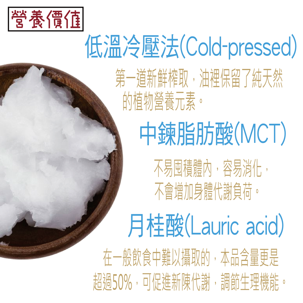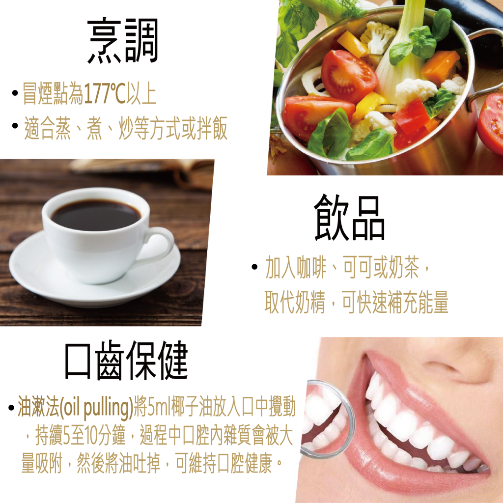 ?● 低溫冷壓第一道新鮮榨取椰子油,未經精煉,保留完整營養