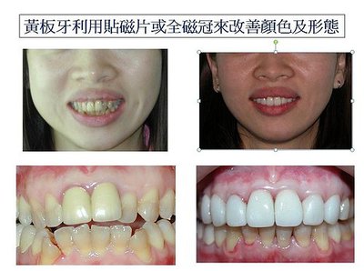 牙套貼磁片或全磁冠改善黃板牙顏色及形態由碧礽牙醫診所 吳碧礽 巫建輝 醫師連合治療”明眸皓齒”是對俊男美女的形...