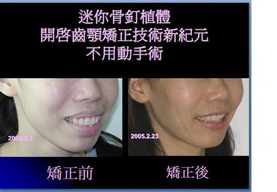 迷你骨釘矯正治療技術和傳統的矯正治療有什麼差別呢? 傳統的矯正治療如果是暴牙患者,在接受牙齒矯正治療時,需要長時間配戴頭套,外觀不雅 要不然就要送開刀做正顎手術才有辦法達到理想效果,迷你骨釘矯正治療技術,在齒槽骨上裝入迷你骨釘以為矯正拉力來源,手術操作簡單方便,而且費用不高,這項技術是有暴牙戽斗的需要矯正患者的福音,以後都可以勇敢開懷大笑。不必擔心頭套的不雅觀或正顎手術的昂貴花費及辛苦的過程!