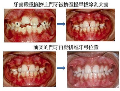 如果牙齒一萌發,便顯示出極端擁擠情形,例如牙齒一前一後或擠成一團,我們要提早做主要是阻斷其發育成更嚴重的不良咬合在未來的矯正治療是須要拔牙的,我們可以提前拔牙,牙齒自動排好,牙齒有自然移動的天性,當有足夠的空隙時,萌發當中的牙齒一般是可以自動移到好的位子,等到牙齒換的差不多再開始矯正,這時因為牙齒已自動排的差不多了,矯正治療的時間不但可以縮短,而且矯正工作也簡單許多,矯正時患者也較不痛,這種提前拔牙的工作,我們稱為系列性拔牙,對於極端擁擠的齒列是有很大改善功效的.但是拔牙的時機是有一定的,在甚麼時候該拔甚麼牙齒,是非常專業的決定,拔牙的時機錯誤所拔的牙也錯誤,有時非但對咬合的改善沒幫助,還造成反效果,實在不可不謹慎!而且當你已經決定做系列拔牙就須要與醫師充份配合,在醫師指定的時間回去覆診,以免錯過拔牙的適當時機!因為系列性拔牙通常須要兩,三年的時間,開始於七,八歲結束於十一,十二歲.等牙齒換的差不多,才開始正式做矯正工作.當中也許矯正醫師會給患者一些簡單的矯正裝製,你也應充份的配合著戴,才能達到事半功倍的效果.系列性的拔牙之後,因為牙齒的排列會改善許多,有些父母就沒繼續帶小孩來做後續的矯正工作.這也可能造成一些後遺症的遺憾!除非矯正醫師明確的告訴你不必做後續的矯正工作了,否則大部份拔過牙的患者,都須要裝矯器來完成咬合的完整性.否則常會發生咬合過深,拔牙空隙沒有完全關閉,或牙根不平行的後遺症就得不償失了.