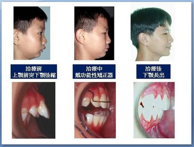 很多父母看到小孩牙齒萌發異常,緊張的到處問朋友或醫師,所得到的答案也莫衷一是,有的說要早做有的卻說要晚開始,其實最好找矯正專科醫師評估看看,一般是較可以得到正確答案的.小孩子的牙齒是可以提早做矯正的,當小孩換了新牙,本來可愛的小臉蛋變醜了,例如上顎門牙前突,而下顎骨卻生長不足,造成下顎後縮,這種情形若任其發展到恆牙全換好,有可能變成極難治療的異常咬合,如果在四顆門牙一長出,就給他戴"功能性的矯正器",對於抑制上顎的發育及刺激下顎的生長有很大的幫助.這種"功能性的矯正器"裝戴的時間不須很久,也很容易拆裝,其效果卻非常顯著,但必須有專業的矯正醫師做正確的診斷,也要裝戴於適當的時機才有好的效果,也就是在換牙期利用骨骼隨著牙齒生長的特性,來抑制或刺激顎骨的生長,而令嚴重的異常咬合消弭於無形,當正式矯正的時期到了,所須要做的矯正工作也就有限了,這也就是可以達到事半功倍的矯正方法.整個治療過程須要患者的合作,因為必須定時回到矯正醫師處做追蹤,每天要戴足醫師要求的時間,才可能達到理想的結果,不過這種阻斷異常咬合惡化的工作,時間雖長但所做的工作並不麻煩,事半功倍的矯正效果也才能達到.如果你不希望自己的寶貝在國中時期(此時恆牙才換完,也是一般牙醫師認為做矯正治療的最佳時機)才開始矯正,而且還矯正得很辛苦(國中的功課很忙又加上矯正工作的負擔),提早一點帶他到矯正醫師處,做些異常咬合阻斷治療的工作是很值得的.雖然父母辛苦點但你的寶貝所得的益處卻很大.