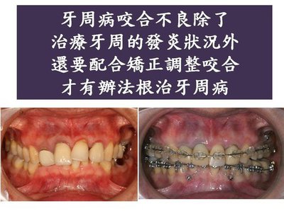 治療牙周病的標準程序,先做深部結石刮除是或利用開刀手術將牙齦肉翻瓣,刮除裡頭的結石與污垢,有的需要輔助補骨治療,才可以達到初步的醫療效果。當控制了牙周病的發炎狀況後,還要看患者的咬合是否有問題,常常咬合不良容易造成牙周病,而牙周病的患者由於牙齒位移而造成不正咬合,如果只治療牙周病不管咬合的問題,牙周病是很難根治的.必須要配合矯正進行咬合調整,才可以徹底的治療牙周病,否則因為咬合不佳可能會再度引發牙周病使牙齒無法保存而脫落! 所以有牙周病的患者,除了要做牙周病控制的治療 還要檢查是否有咬合不良的問題要一併作矯正治療調整咬合,才可以徹底根治牙周病的問題!