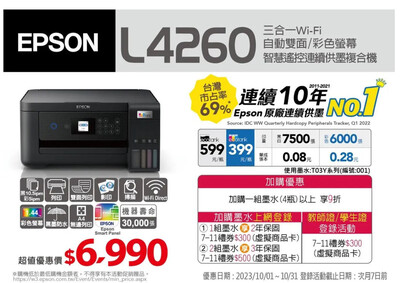 EPSON L4260 三合一Wi-Fi 自動雙面/彩色螢幕 智慧遙控連續供墨複合機 購買主機享1年保固;主機加購一組墨水升級2年保固、加購兩組墨水升級3年保固 防水黑色墨水一瓶可印7,500...