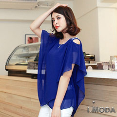 OB嚴選0924新品 時尚美感~不對稱層次珍珠綴飾露肩雪紡長版上衣‧2色』