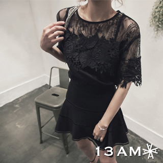 • 蕾絲雕花黑色雪紡上衣-13AM