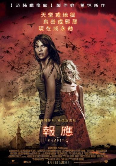 四月初上映的「報應」(The Reaping),已經上二輪了。衝著兩屆奧斯卡影后希拉蕊史旺興沖沖跑去看,電影的特效做得不錯,內容也相當特別,如果說這是一部宗教意涵的電影倒也不為過,但是非教徒者需要做一下功課才瞭解喔。(版主幫你做好了,是有關聖經中的「十災」的來龍去脈,請見摩西故事。)